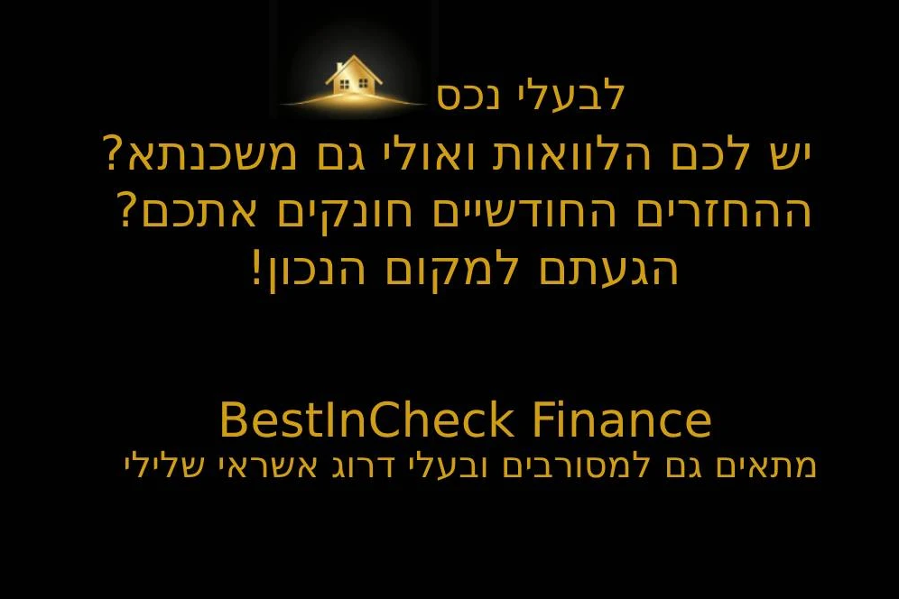 BestInCheck מתמחה במתן פתרונות מימון לאנשים עם היסטוריית אשראי בעייתית. אנו מספקים שירותים המותאמים אישית ללקוחות עם BDI נמוך או שלילי, מוגבלים, ופושטי רגל. השירותים שלנו כוללים הלוואות גישור, איחוד הלוואות, תיקון דירוג אשראי, והקטנת החזר חודשי, כדי להחזיר אתכם למסלול כלכלי נכון. אנו פועלים עם תכנית מותאמת אישית ועם צוות מומחים שילווה אתכם לאורך כל התהליך. חברתנו מציעה עד 85% מימון מערך הנכס, תשלום רק על בסיס הצלחה ורק לאחר קבלת הכסף לחשבונכם, וזמינות מלאה לכל שאלה או התייעצות.